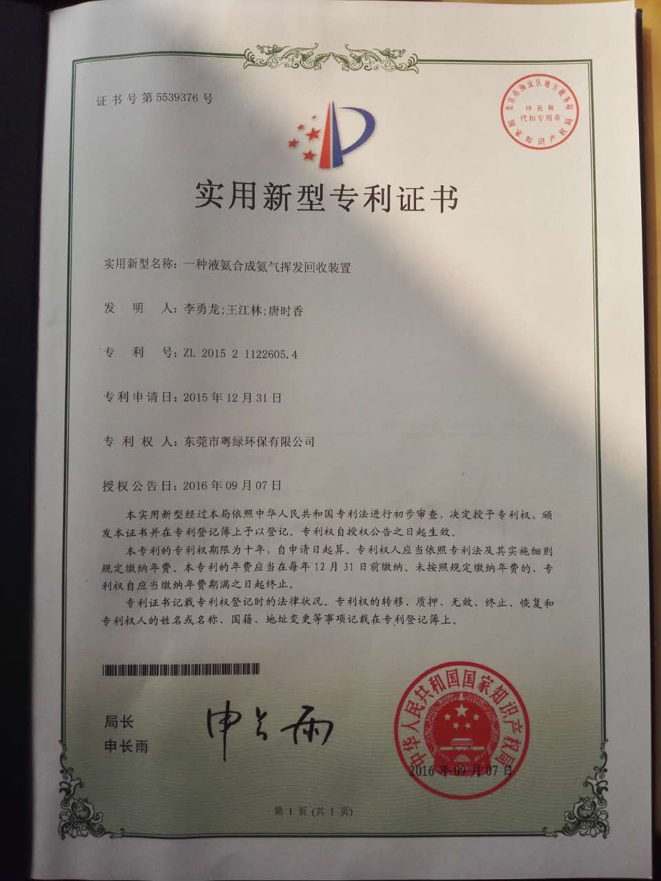 一种液氨合成氨气挥发回收装置专利证书