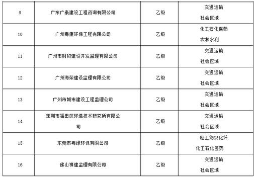 2016年第一批广东省建设项目环境监理资格行业评定获证单位名单