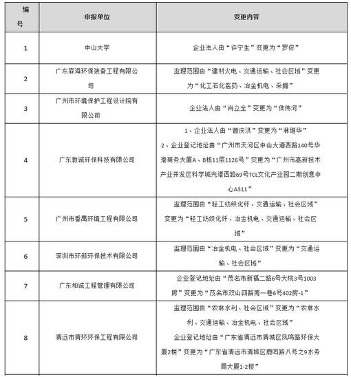 根据《广东省建设项目环境监理资格行业评定管理办法(试行)》(粤环协〔2013〕32号)的有关规定,我会对2016年第一批申报广东省建设项目环境监理资格行业评定的单位进行了现场核查,经广东省建设项目环境监理资格行业评定评审委员会审定及公示无异议后,批准“珠江水资源保护科学研究所”等16家单位为2016年第一批广东省建设项目环境监理资格行业评定获证单位,同意“中山大学”等11家单位的变更申请,现将获证单位及变更单位名单予以公布。